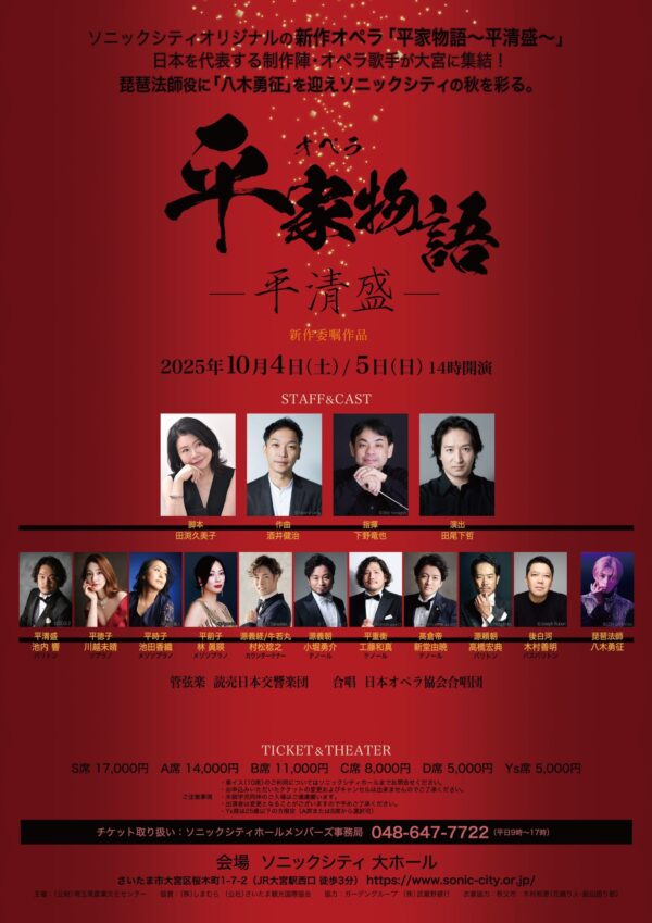皆様ご存知かとは思いますが声は喉にある声帯という器官を息で振動させて音を出します。 この声帯は粘膜みたいなものなので、体の水分が失われればこちらも水分が減って乾燥してきてうまく振動しなくなってきてしまいます。 そうなると声がカサカサしてきたりそのまま無理すれば傷める原因にもなります。 声の健康のためにも水分は欠かせませんね! その他喉の健康に役立つのはビタミンB群だそうです! 粘膜も言ってみれば皮膚の一部なので皮膚によい、お肌に良いものは基本的に喉にもいいんですよ! 水分とビタミン、是非試してみてください! さて、ここでいきなりですが私の関わっておりますオペラ公演の宣伝です! NOPPO MUSIC SCHOOLもあるこの大宮での公演です! 駅の反対側にある大宮ソニックシティという場所の大ホールで10月4日、5日の二日間、新作オペラの「平家物語」が上演されます。 こちらかの有名な平家物語のオペラ版ですがなんと今年完成した手のほやほや新作、そしてこの日が初演となります! 私は平家物語の重要人物、「平清盛」役!