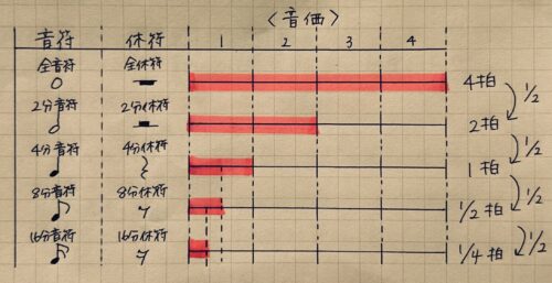 音の打点が同じでも音価によって聞こえる印象が大きく変わります。