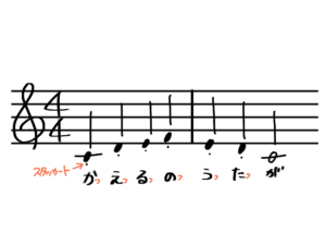 スタッカートを使うことによって全体的に跳ねた感覚になります。